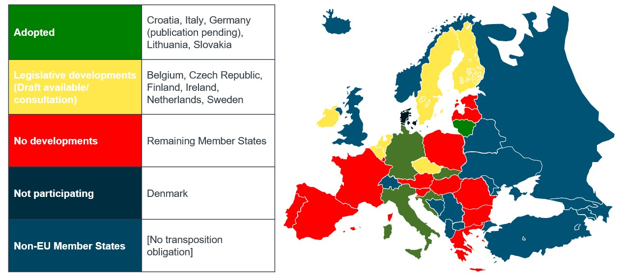 As of February 2026, the transposition status of the e-Evidence Directive across EU Member States varies significantly. Only four Member States have adopted implementing legislation: Croatia, Italy, Lithuania, and Slovakia. Germany adopted its implementation in Parliament, with publication in the official journal soon awaited. Six Member States have draft legislation available: Belgium, Czech Republic, Finland, Ireland, Netherlands, and Sweden. The remaining Member States have no publicly available developments. Denmark has opted out from the e-Evidence Regime.