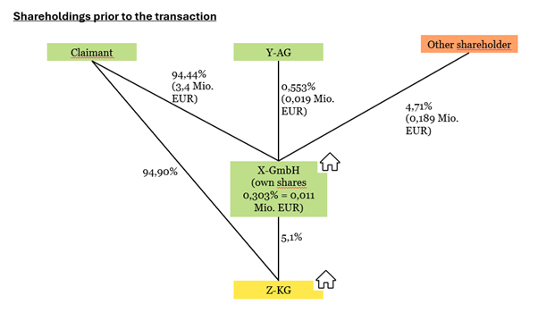 In the hands of the claimant, at least 95% of the shares in X-GmbH had been consolidated, and accordingly the statutory condition of Sec. 1 para. 3 GrEStG was fulfilled (marginal no. 20). By virtue of the notarised agreement of 26 January 2010, X-GmbH had acquired own shares with a nominal value of EUR 19,920 from Y-AG. Following the transaction, X-GmbH held a total of EUR 30,840 in its own share capital of EUR 3,600,000. Since the shares held by X-GmbH in itself are not to be taken into account when calculating the relevant percentage, the claimant's interest in X-GmbH mathematically increased to 95.26% (EUR 3,400,000 out of EUR 3,569,160).