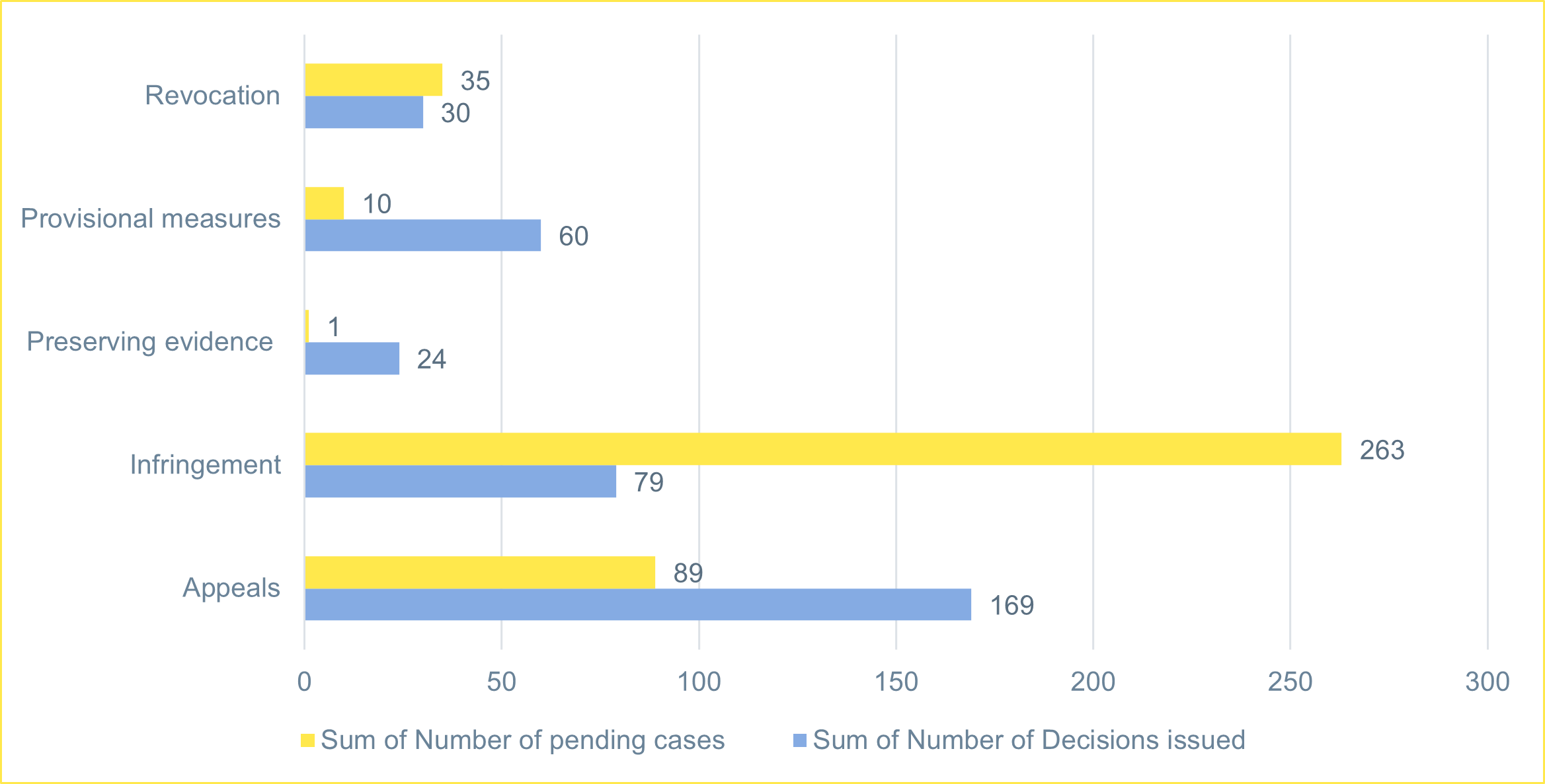 This graphic illustrates the number of decisions issued and pending for appeals, infringement, preserving evidence, provisional measures, and revocation.